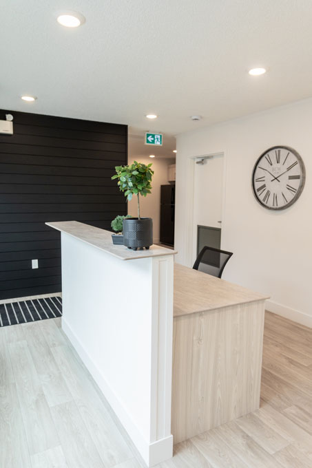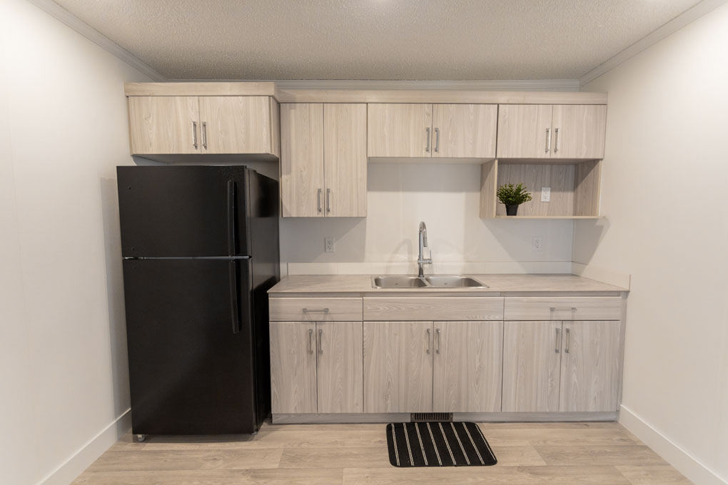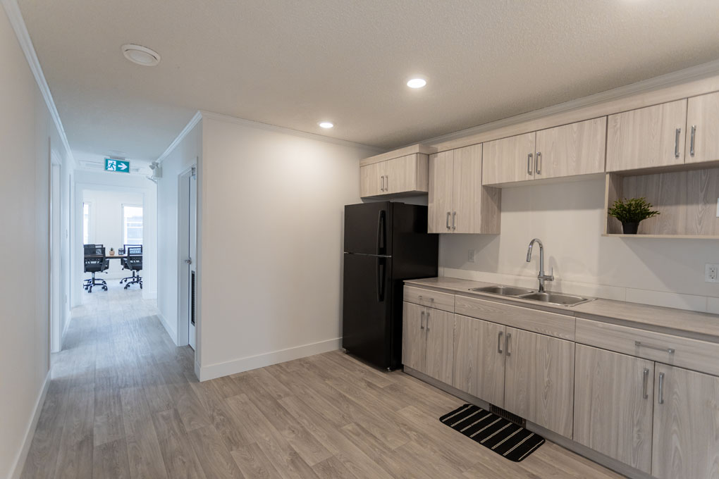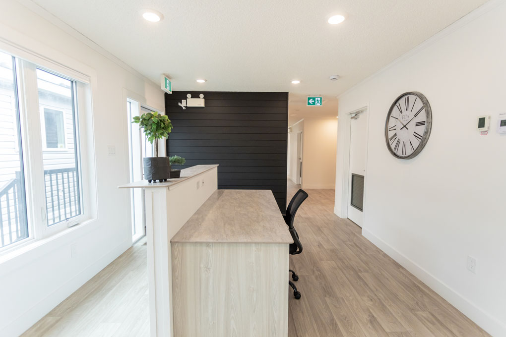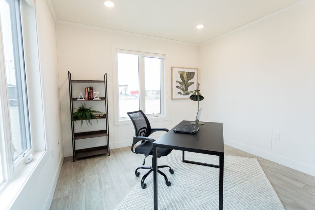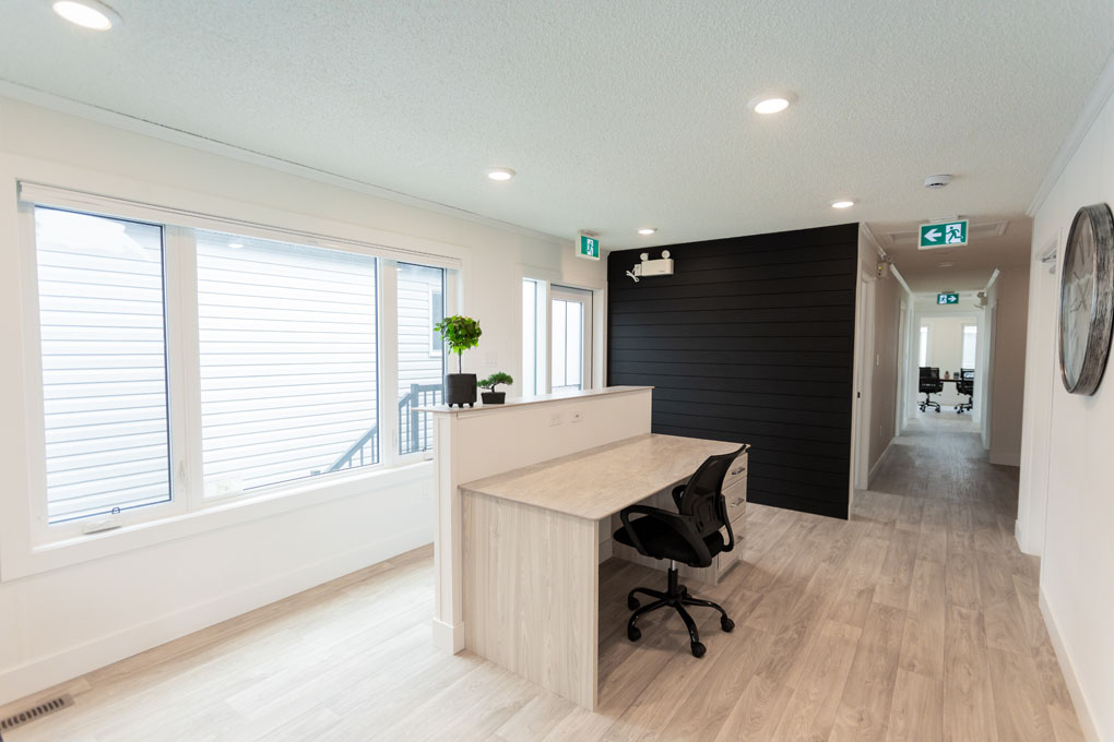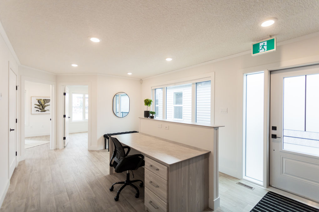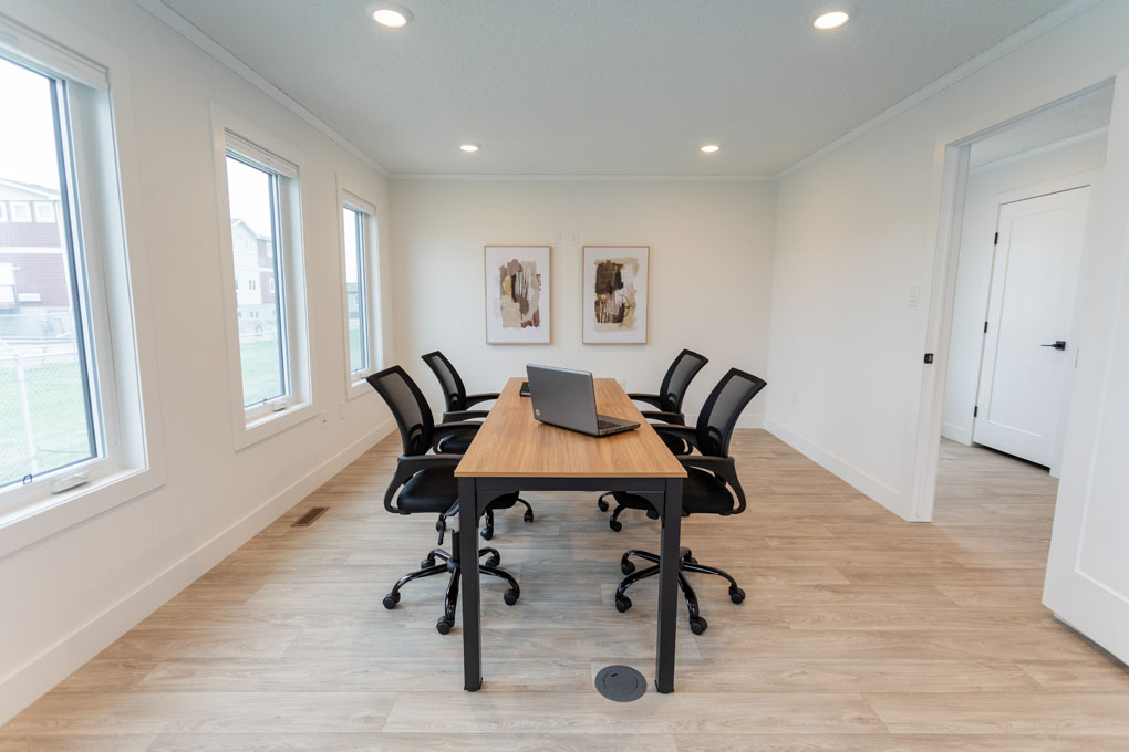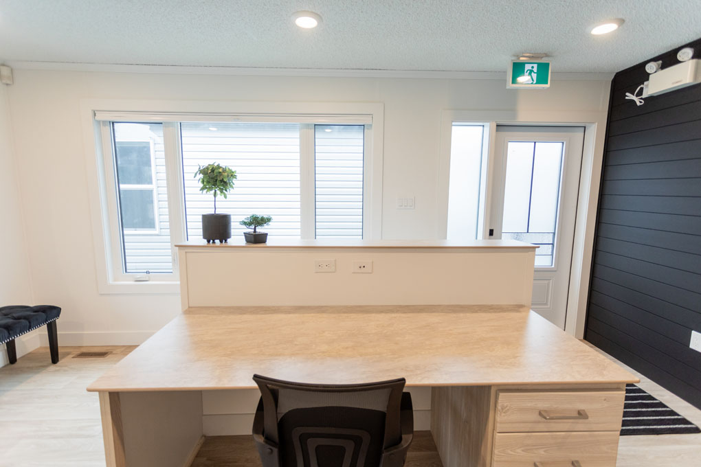 Our new modular office show home is the perfect solution for any business needing a fast, flexible, and functional workspace. Built at 1,400 square feet, this office is designed to accommodate up to seven private offices. For the show home, we’ve customized the layout to include five offices and one large boardroom – perfect for meetings, but easily convertible into two additional offices if needed. It also features a full kitchen, bathroom, storage room, and mechanical room, plus a bright, open common area with a welcoming reception space to greet clients.