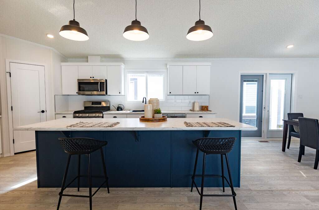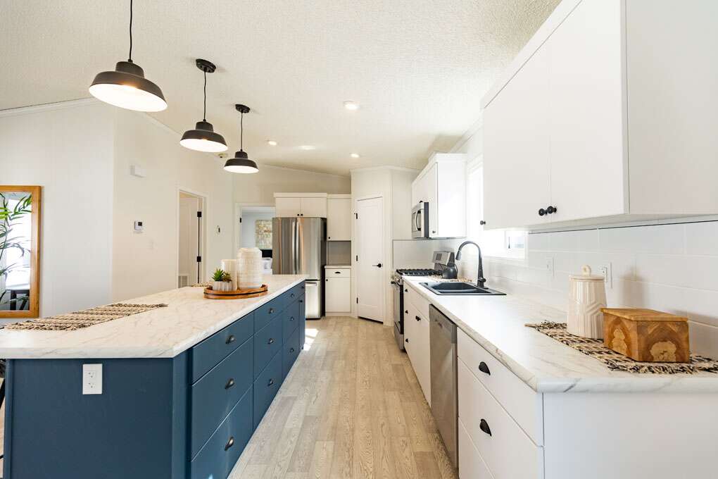 Step inside and discover the heart of the home, where a large living room and separate family room await, providing ample space for gatherings and everyday activities. The open-concept design seamlessly connects the dining room to the kitchen, where you’ll find a spacious island and convenient corner pantry, making meal prep a breeze. With additional windows strategically placed throughout, the Crestview show home is flooded with natural light, creating an inviting and airy atmosphere that welcomes you from the moment you step inside. We opted for a timeless palette of whites accentuated with a vibrant pop of blue to create an eye-catching decor package.