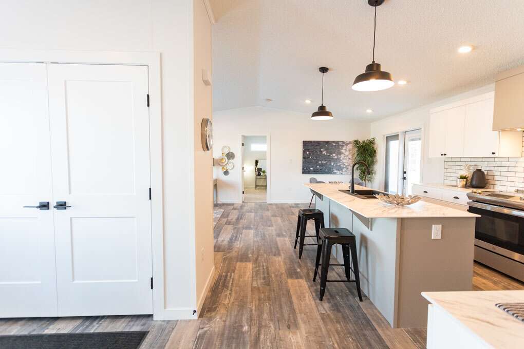 Inside, no detail has been overlooked. The spacious foyer welcomes you with open arms, offering not one, but two front closets to cater to your storage needs. Featuring a beautiful coffee bar off to the side and a spacious island at its center, this kitchen is as functional as it is stylish. The full tile backsplash, accentuated by eye-catching black grout, adds a touch of elegance to the space. Black hardware and fixtures, including farm-style pendants over the island, lend a contemporary flair that’s sure to impress. With the addition of pot lights, the kitchen creates the perfect ambiance for culinary creativity. The walk-through pantry, seamlessly connected to the utility room, ensures that daily tasks like unpacking groceries are a breeze.